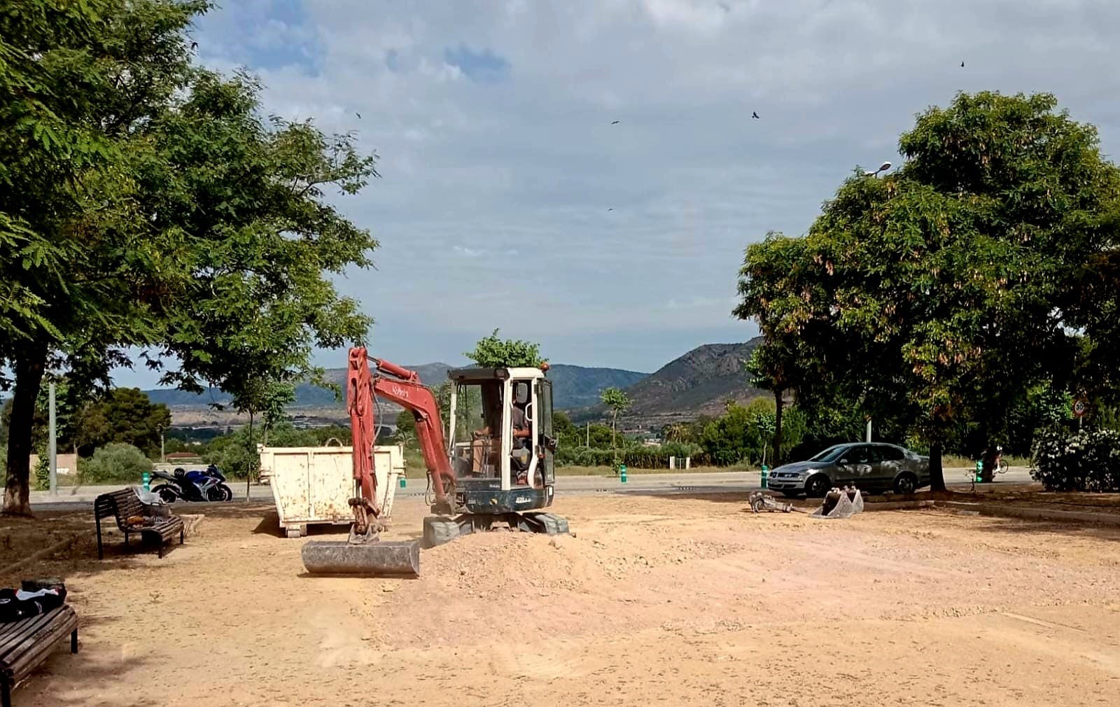 Los trabajos han comenzado con la preparación del terreno para la implantación del caucho y la posterior instalación de la zona lúdica para los más pequeños que incluye juegos tipo casita y balancines