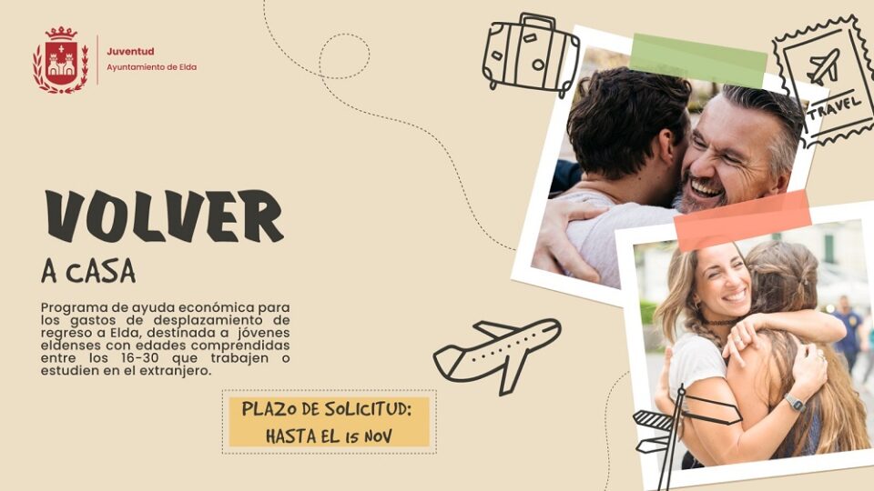 El Ayuntamiento de Elda, a través de la Concejalía de Juventud, ha puesto en marcha un programa de ayudas económicas que, bajo el nombre de ‘Volver a Casa’, están destinadas a sufragar gastos de desplazamiento a aquellos jóvenes de Elda que estudian o trabajan en el extranjero y regresaron o regresan a la ciudad para visitar a sus familiares.