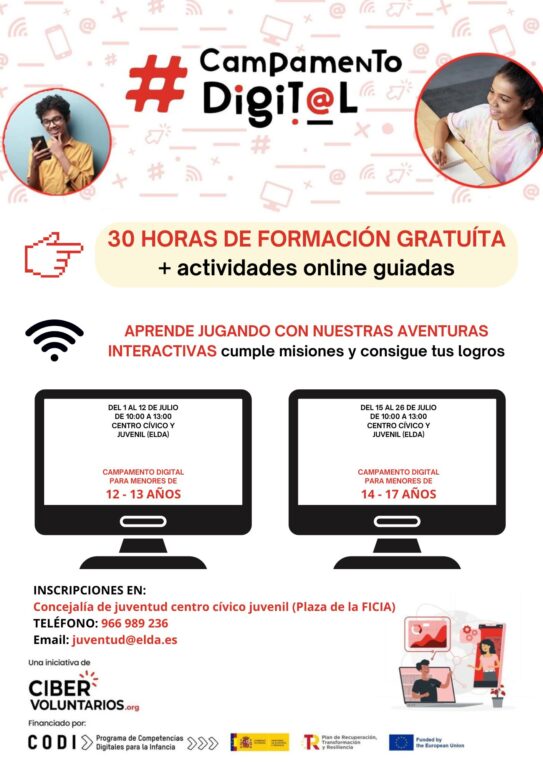 El Ayuntamiento de Elda, a través de la Concejalía de Juventud, ha organizado dos Campamentos Digitales que se celebrarán a lo largo del mes de julio. La actividad, llevada a cabo por Cibervoluntarios, se desarrollará en dos partes: del 1 al 12 de julio, para chicos y chicas de 12 y 13 años, y del 15 al 28 de julio, para jóvenes de 14 a 17 años.