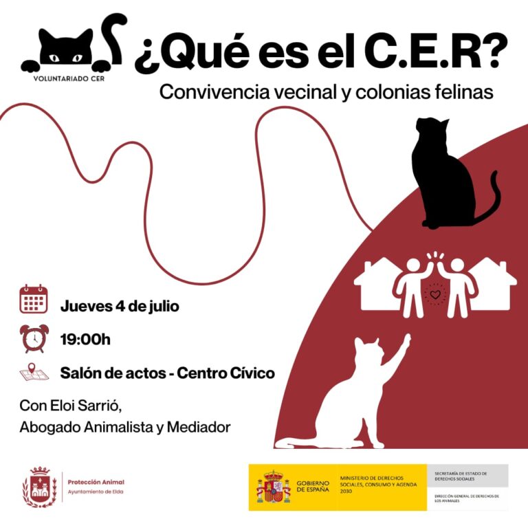 El ciclo ‘¿Qué es el CER?’ cntinuará próximamente con nuevas charlas divulgativas sobre el proyecto de gestión de colonias felinas que está impulsando el Ayuntamiento de Elda, con el objetivo de mejorar la convivencia y el cuidado de los gatos callejeros. El proyecto del CER está financiado por el Ministerio de Derechos Sociales, Consumo y Agenda 2030.