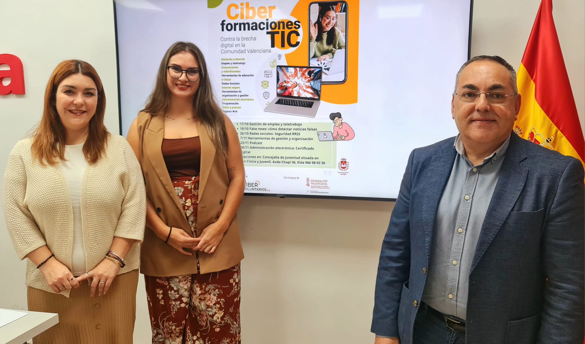 Las concejalas de Juventud, Anabel García, y de Educación, María Gisbert, y el edil de Brecha Digital, Enrique Quílez, han dado a conocer una iniciativa que se enmarca en el convenio firmado con Cibervoluntarios, «una ONG española de referencia internacional centrada en impulsar una transición digital inclusiva y eliminar la brecha digital. Facilitan formación gratuita en competencias digitales, promueven la innovación social y el empoderamiento de la ciudadanía gracias al uso de la tecnología«, ha explicado Anabel García.