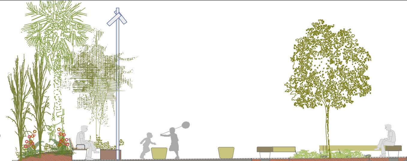 En ese sentido, la nueva plaza contará con un árbol de gran porte en el centro de la plaza que aportará sombra a todo el entorno, y se configurará otra zona de descanso y estancia formada por una jardinera con bancos que incluirá un total de ocho árboles de distintas especies y un manto verde, con el fin de reducir la temperatura de su entorno próximo así como generar una barrera acústica con el vial.