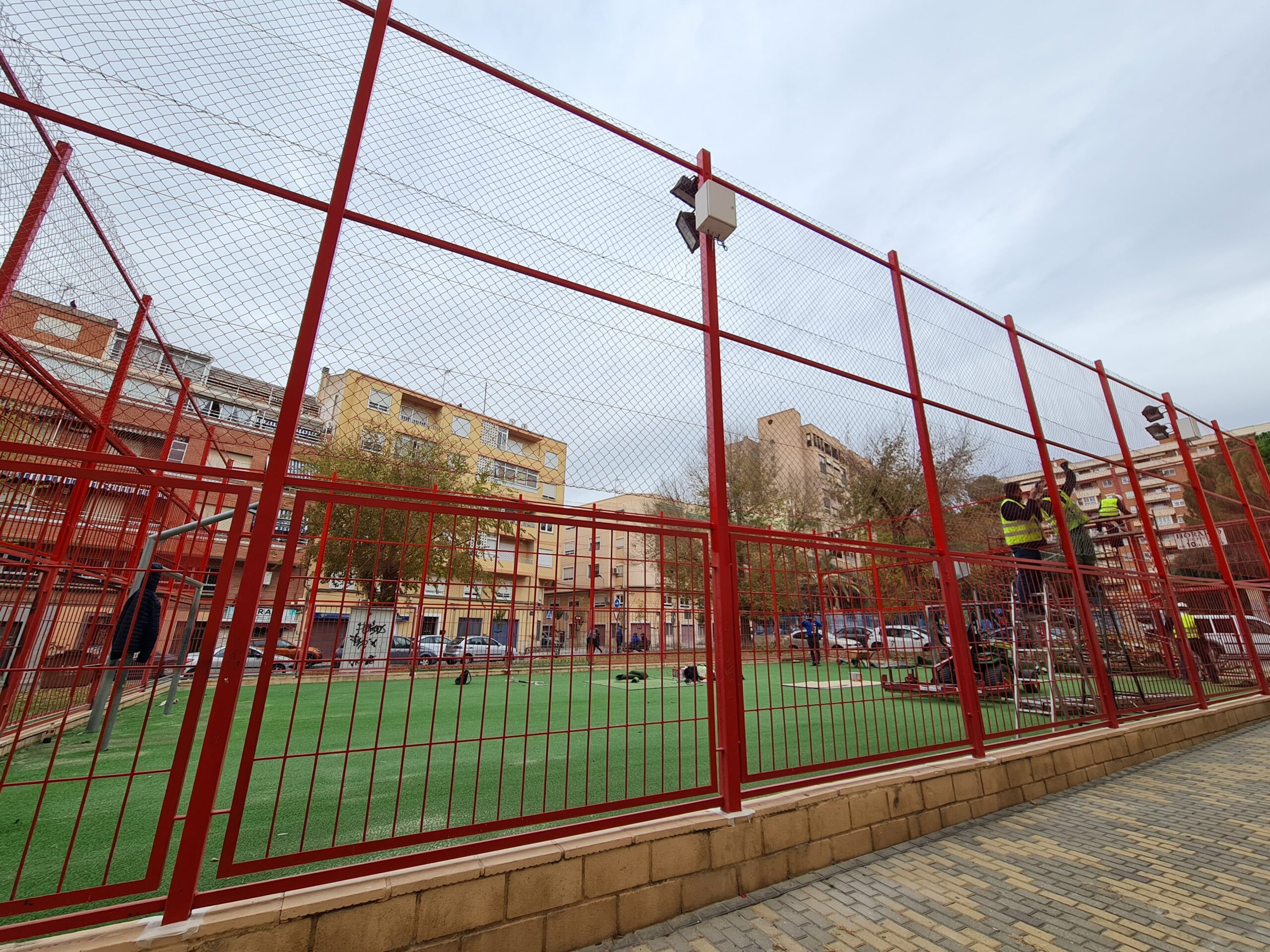 3 de enero de 2024 – La Concejalía de Espacio Público del Ayuntamiento de Elda renueva la pista deportiva urbana situada en el barrio de San Francisco de Sales, junto al Parque Cocoliche, con el objetivo de mejorar la calidad del césped sintético donde juegan a diario los más pequeños, así como la reparación y pintado de todo el vallado perimetral para aumentar la seguridad durante los momentos de juego y la práctica de algún deporte, tanto fútbol como baloncesto.