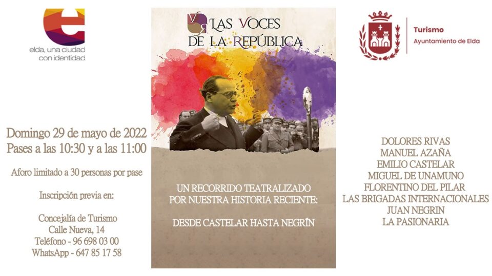 El Ayuntamiento de Elda, a través de la Concejalía de Turismo, retoma la experiencia turística teatralizada ‘Las Voces de la República’, tal y como ha anunciado esta mañana la concejala de Turismo, Rosa Vidal. La edil ha recordado que “se trata de una propuesta histórico-turística que abarca una etapa de la historia de España que arranca en el último cuarto del siglo XIX con Emilio Castelar, quien vivió en Elda durante su infancia, y concluye en 1939 con la salida del Gobierno de la República con destino a Francia”.