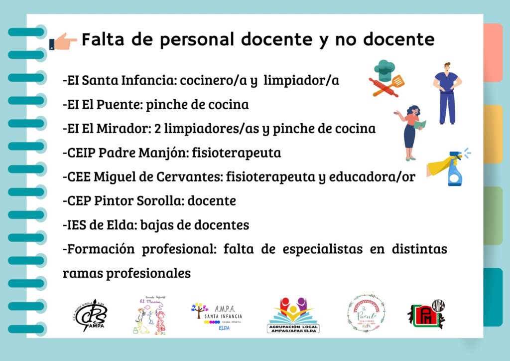 El presidente de la Agrupación Local de AMPAS de Elda ha concretado las faltas que quedan por cubrir, con especial incidencia en Educación Infantil: «En las escuelas infantiles la última educadora en incorporarse lo hizo este pasado lunes, un mes después del inicio del curso. Además, falta personal de cocina y de limpieza lo que supone una sobrecarga de trabajo para los equipos de los distintos centros que, además, prestan los servicios en óptimas condiciones sufriendo los más peques las consecuencias de estas carencias».