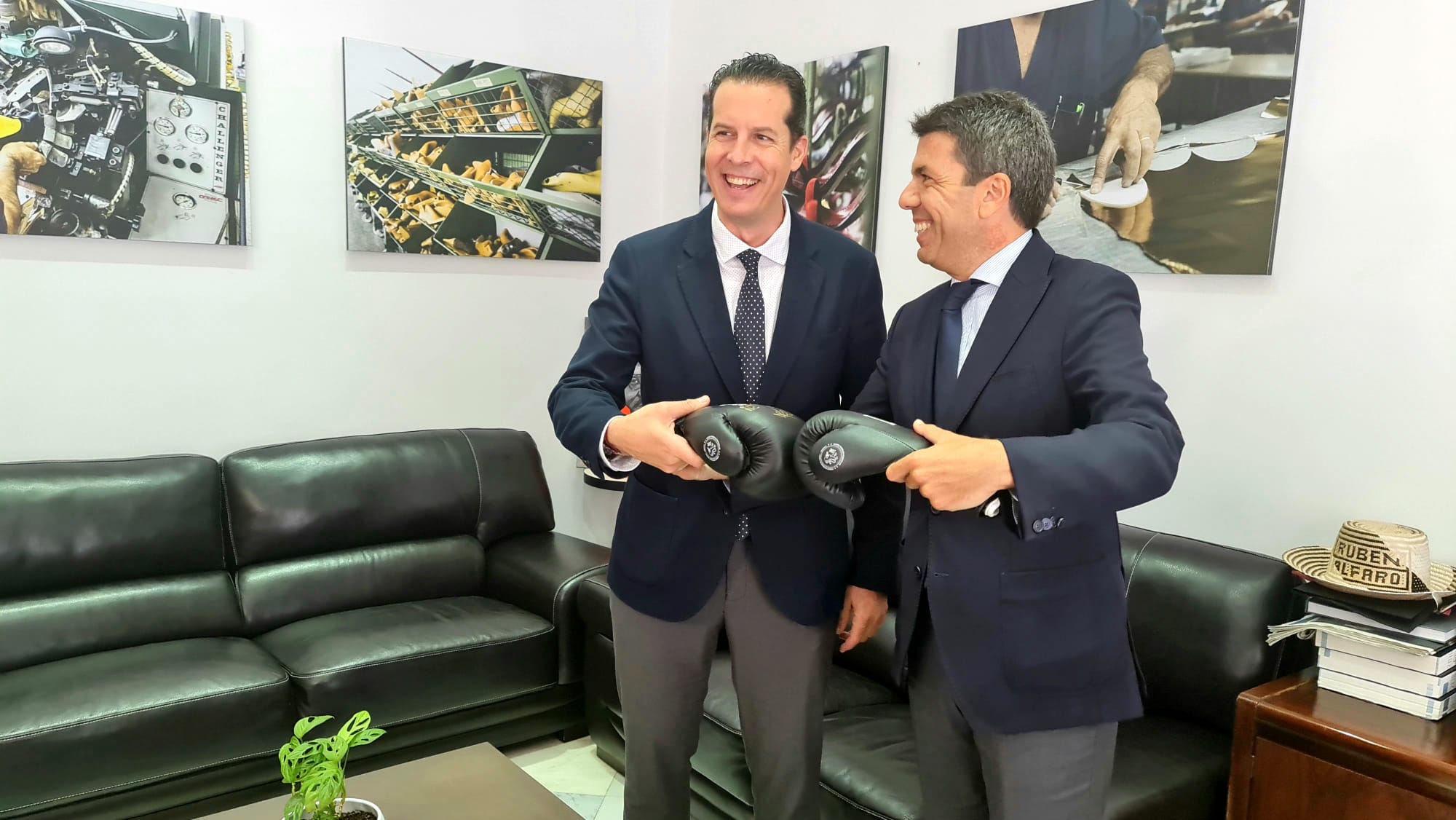 El President de la Generalitat Valenciana, Carlos Mazón, ha visitado esta mañana el Ayuntamiento de Elda, donde se ha reunido con el alcalde Rubén Alfaro para impulsar y abordar diferentes actuaciones e inversiones del Consell en la ciudad.
