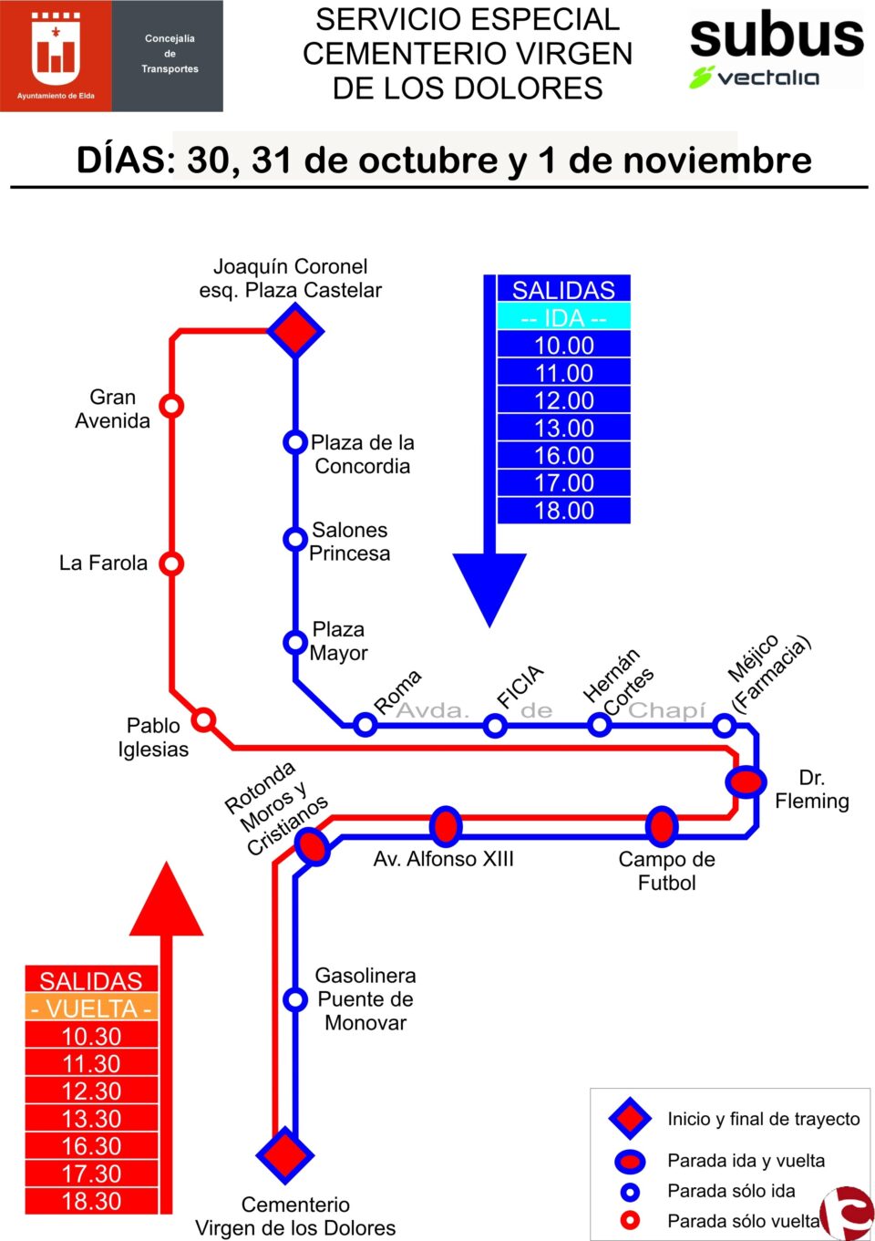 Como en años anteriores, la Concejalía de Transportes del Ayuntamiento de Elda ha establecido un servicio especial al Cementerio Virgen de los Dolores, con motivo de la festividad del 1 de noviembre.