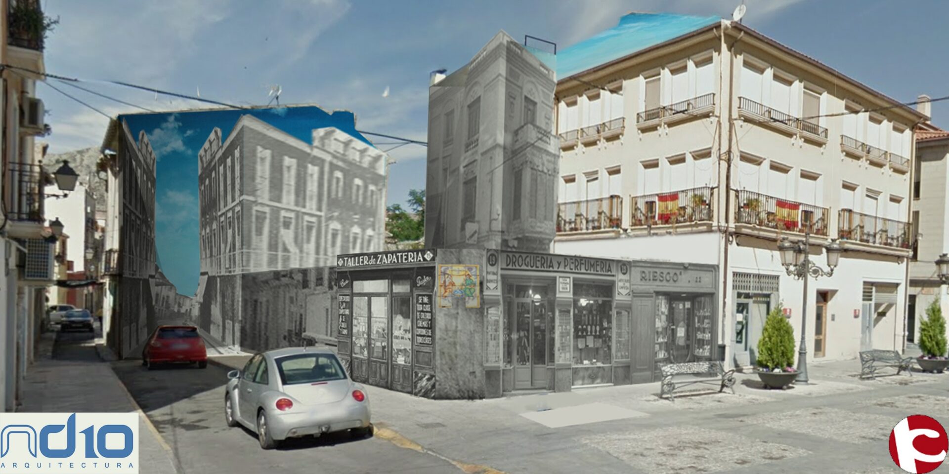 La concejalía de Urbanismo ha plasmado uno de sus objetivos dentro de su función de Renovación Urbana Sostenible, recuperando un enclave, un solar municipal de la plaza del Ayuntamiento. Aunque todavía no está terminado, ya se puede apreciar este gran mural en clave de trampantojo, ambientando, mediante una ilusión visual, calles, edificios y la casa tienda ya desaparecida.