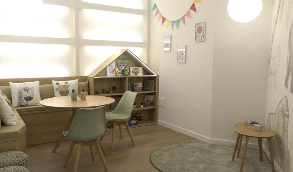 La decoración de esta sala se ha realizado empleando mobiliario cómodo y seguro y utilizando colores suaves para crear un ambiente cálido. La sala cuenta con pizarras, juegos de mesa y juguetes.