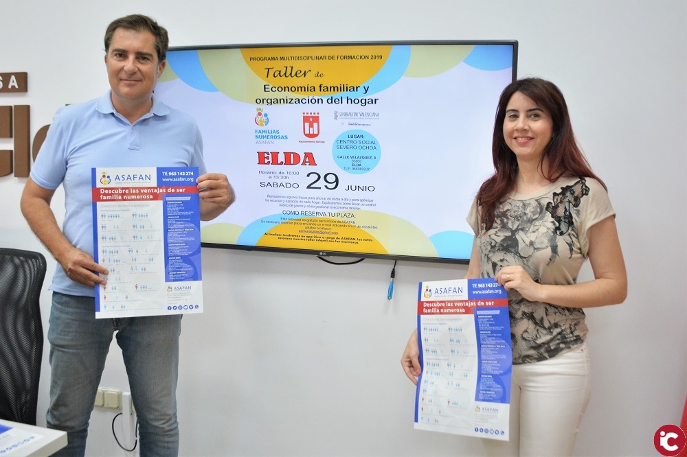La Asociación Alicantina de Familias Numerosas (Asafan) ha organizado, en colaboración con la Concejalía de Bienestar Social del Ayuntamiento de Elda, un taller de economía familiar y organización del hogar que tendrá lugar este sábado 29 de junio, de 10 a 13 horas, en el Centro Social Severo Ochoa. En esta actividad se ofrecerán diferentes claves para que las familias numerosas mejoren su economía a través del ahorro o realizando compras más económicas, entre otros aspectos.