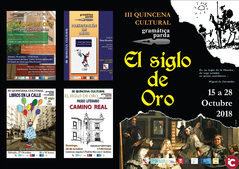 La primera de ellas, y que servirá para inaugurar esta Quincena, será una conferencia que lleva por título “El siglo de Oro”, impartida por Gabriel Segura, cronista oficial de la ciudad de Elda, el lunes 15 a las 20 horas en el salón de actos de la Fundación Paurides. La presentación del acto correrá a cargo de Victoria García, presidenta de Gramática Parda.