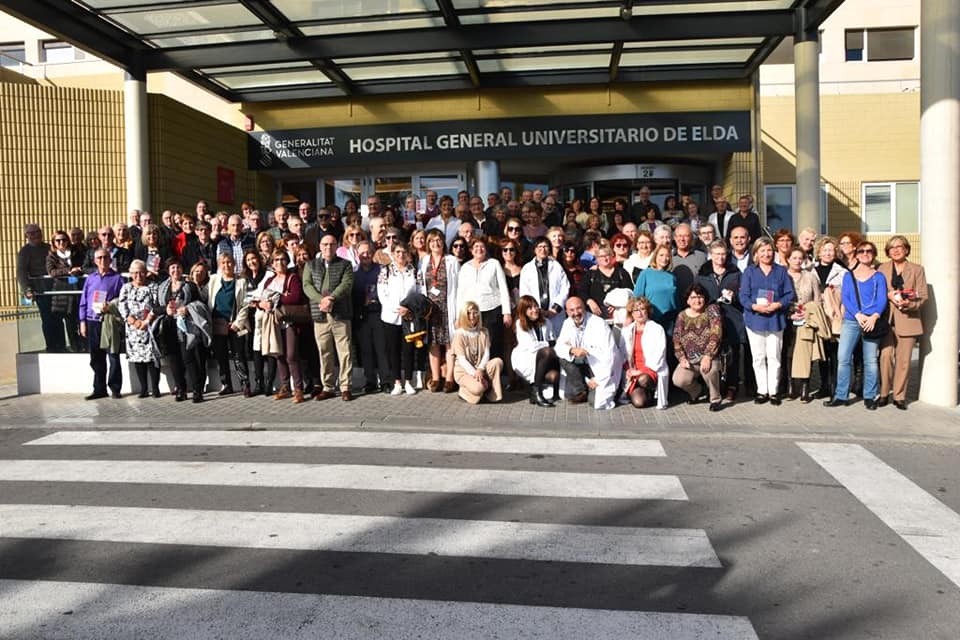 El detalle que se ha entregado hace referencia a los tres pilares de su la trayectoria profesional: PACIENTES, PROFESIONALES Y COMPROMISO. Un compromiso que ha sido su oportunidad de contribuir cada uno y cada una con su aportación desde su puesto de trabajo, a que el proyecto de mejorar la atención sanitaria, en definitiva, de mejorar la salud de todos y de todas, se haga posible en el día a día. La Gerente indicó que si se recogen las trayectorias de las 180 personas que se han jubilado en estos tres años, sumarían más de 5700 años dedicados a la atención asistencial, al acompañamiento, al mantenimiento, a la gestión, a ofrecer una sanidad pública y de calidad a pacientes y usuarios que, en conjunto, conlleva al cumplimiento de sus objetivos. El homenaje ha culminado en una gran foto de familia en la entrada principal del Hospital General Universitario de Elda.»