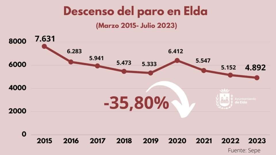 8 de agosto de 2023.- La creación de empleo se mantiene firme en Elda y los datos del mes de julio, facilitados por el Servicio de Empleo Público Estatal (SEPE), confirman que la bajada del paro es constante. En el último mes el número de personas sin trabajo descendió por noveno mes consecutivo, acumulando ya una caída del 8,16% en los últimos doce meses. De julio de 2022 a julio de 2023 el número de desempleados en Elda se ha reducido en 435 personas, consolidándose en los niveles más bajos desde el verano de 2017. La cifra total de desempleados, que en junio bajó por primera vez de la barrera de las 5.000 personas, se ha situado ya por debajo de las 4.900 después de que en julio haya bajado en 30 personas el número de inscritos en la oficina de empleo.