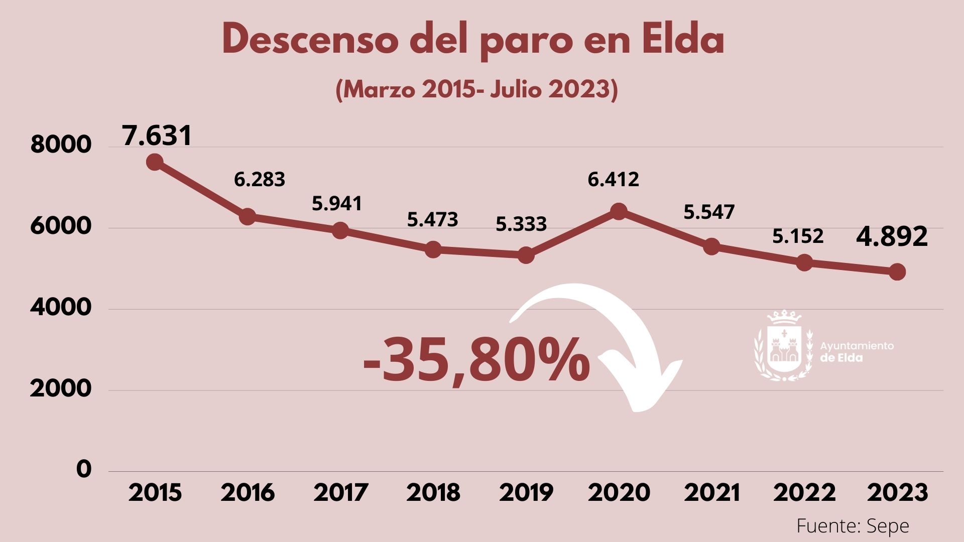En los últimos doce meses (de julio de 2022 a julio de 2023) el número de parados ha descendido en todos ellos, salvo en agosto y octubre del año pasado. El histórico desde marzo de 2015 hasta la fecha refleja un descenso del desempleo en Elda del 35,8%, con una reducción de 2.739 parados menos. Los datos de julio de 2023 consolidan la recuperación de la actividad económica en Elda tras la pandemia. En ese mismo mes de 2020, el número de parados se situó en las 6.337 personas como consecuencia de los efectos de la crisis sanitaria en los sectores productivos. Desde ese mes, el tejido económico eldense registra 1.445 parados menos, lo que supone una bajada del 22,8%.