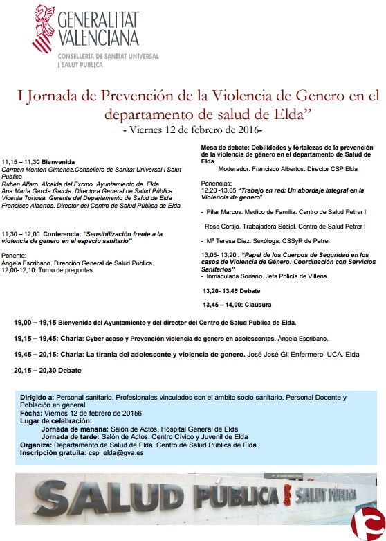 El día 12 de Febrero se va a realizar la I Jornada de Prevencón de la Violencia de Género del Departamento de Salud de Elda