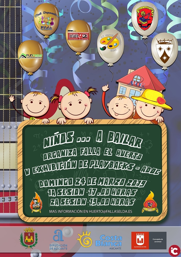 Niños a bailar se crea con la intención de que niños y jóvenes entre los 12 y 25 años de edad demuestren sus cualidades artísticas, deportivas y rítmicas ante el público asistente en la modalidad en la que destacan. La exhibición contará este año con la participación de los Colegios Santa María del Carmen de Elda, Pintor Sorolla de Elda y Santo Domingo Savio de Petrer, de igual forma en otras modalidades lo harán el Club Deportivo Fit Dreams de Elda, el Centro de baile Estudio 42 y como actuación especial de la tarde representarán una coreografía los chicos y chicas del Cetro Funredis de Elda. Una tarde llena de arte y espectáculo que no dejará indiferente a nadie, pues cuenta del interés suscitado por este evento es el hecho de que la comisión de la Falla El Huerto ha colgado el cartel de lleno absoluto teniendo que realizar dos sesiones del evento, una prevista para las 17:00 horas y otra para las 19:00 horas.