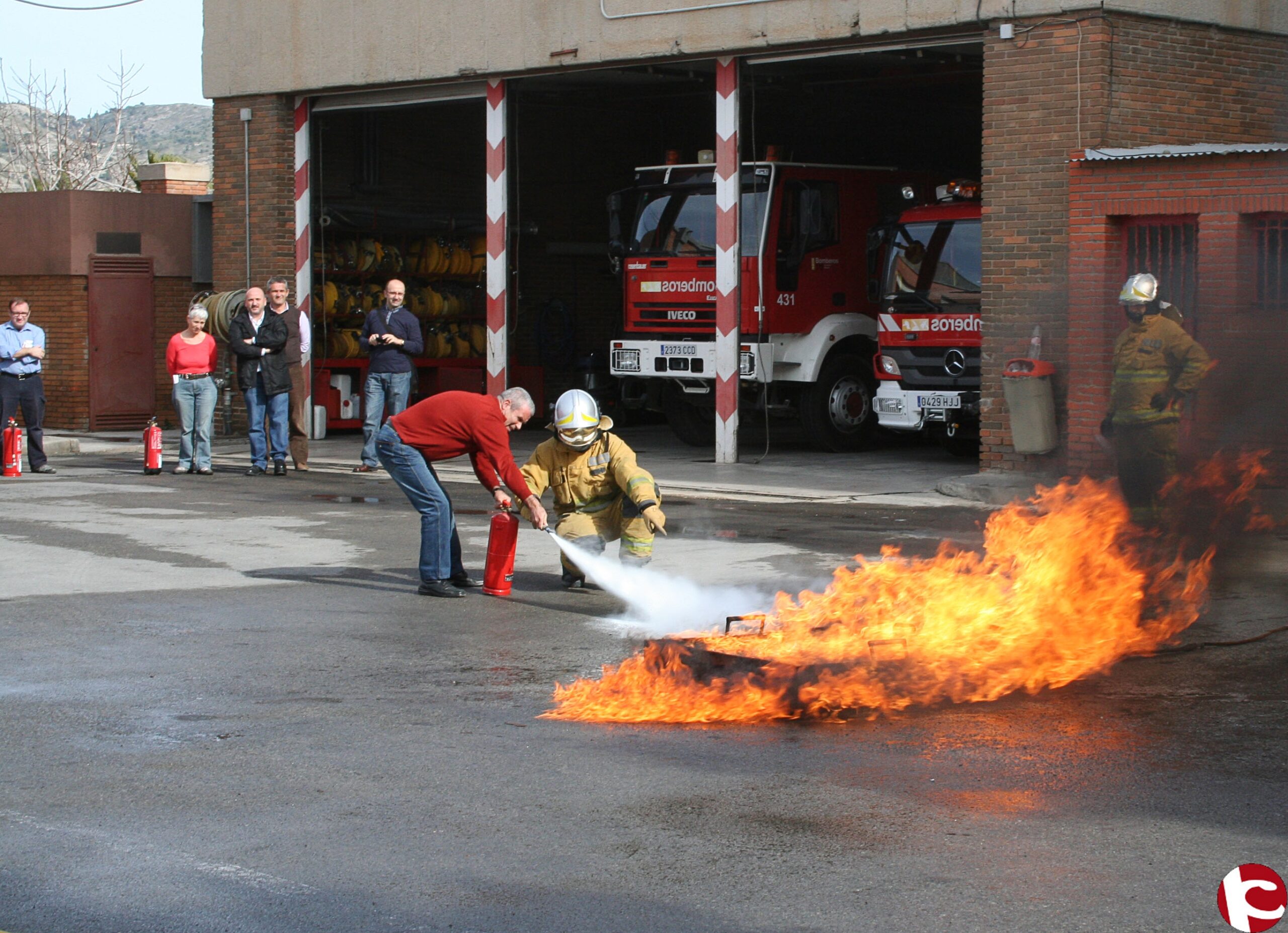 Para completar la parte teórica el Parque Comarcal de Bomberos de Elda acogió ayer una práctica con fuego real y equipos de extinción, en la que profesionales del Hospital de Elda pudieron ver el comportamiento del fuego y apagarlo ellos mismos con extintores.