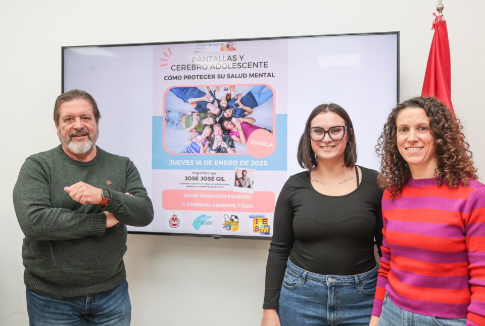 La concejala de Educación, María Gisbert, ha presentado esta mañana la charla-taller ‘Pantallas y cerebro adolescente. Cómo proteger su salud mental’ , actividad que se enmarca en la Escuela de Familias organizada por el IES Monastil en colaboración con el Ayuntamiento de Elda. La edil ha estado acompañada por la vicedirectora del centro educativo, Laura Justamante, y por José Gil, enfermero expero en trabajo con adolescentes que será el encargado de ofrecer el taller.
