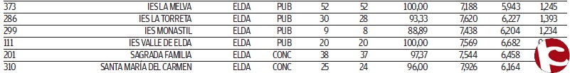 De acuerdo con la información publicada por el Diario Información de los centros presentados a PAU en la Comunidad Valenciana, se desprende que el IES Valle de Elda a quedado en la posición 111 de 451.
