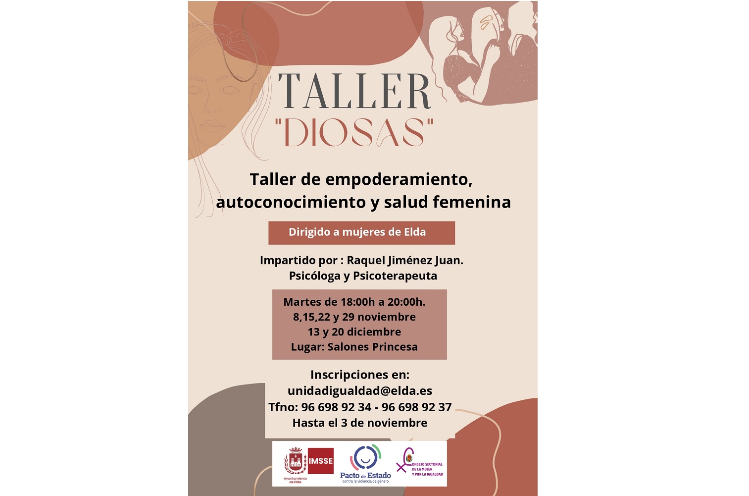 25 de octubre de 2022.- El Instituto Municipal de Servicios Sociales de Elda (IMSSE), a través de la Unidad de Igualdad, ha programado el Taller ‘Diosas’, un taller dirigido a las mujeres de Elda en el que, por medio de diferentes actividades dirigidas por Raquel Jiménez Juan, psicóloga y psicoterapeuta, con formación en igualdad y prevención de la violencia de género, se abordará el empoderamiento, el autoconocimiento y la salud femenina.