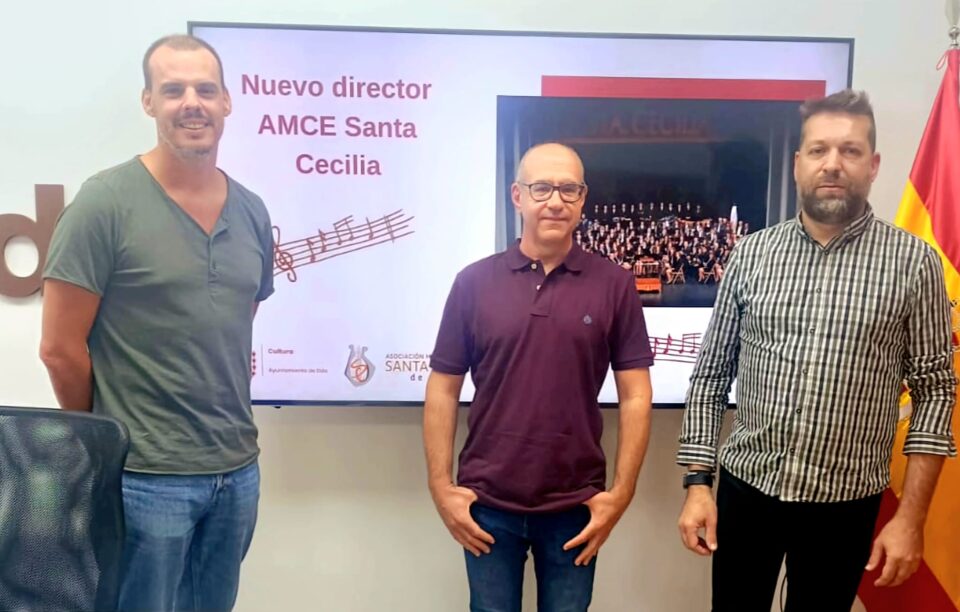 19 de septiembre de 2023.- El eldense Rafael Rico ha sido presentado hoy como nuevo director de la Banda de la AMCE Santa Cecilia. El concejal de Cultura, Iñaki Pérez, que ha estado acompañado por el presidente de la AMCE Santa Cecilia, David Mancera, y por el propio Rafael Rico, ha destacado que «el nuevo director es una persona dedicada a la música y la cultura en nuestra ciudad. Con sus amplios conocimientos y experiencia confiamos en que llevará a la Banda Santa Cecilia a nuevos niveles de excelencia artística». David Mancera ha indicado que «el proyecto de Rafael Rico ha sido elegido entre 28 propuestas».