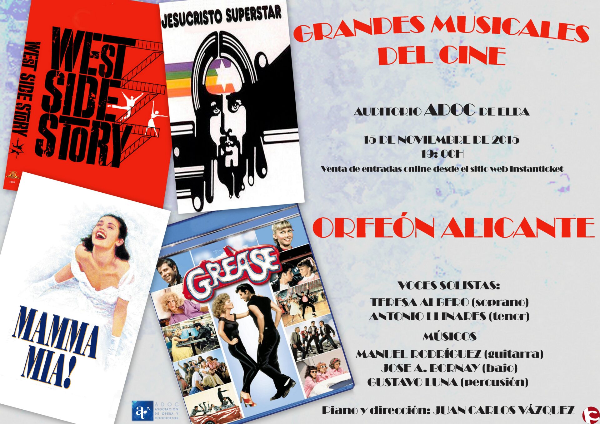 Con un atractivo programa, el Orfeón Alicante dirigido por D. Juan Carlos Vázquez, solistas y grandes músicos, interpretará obras de musicales tan conocidos como Grease, Wet Side story,? Jesucristo Super Star junto con canciones tan conocidas como una selección del repertorio de ABBA y alguna sorpresa.