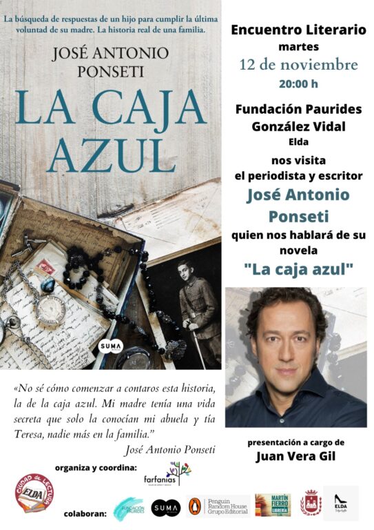 La Fundación Paurides acoge el próximo martes 12 de noviembre, a las 20:00 horas, la presentación de la novela ‘La caja azul’, del periodista y escritor José Antonio Ponseti, acto organizado por Farfanías. La obra está basada en las cartas, recortes de periódicos, notas de la Cruz Roja y documentación sobre su abuelo Antonio, republicano desaparecido en combate en la Batalla del Ebro durante la contienda, que estaban dentro de una caja azul que le entregó su madre antes de fallecer.
