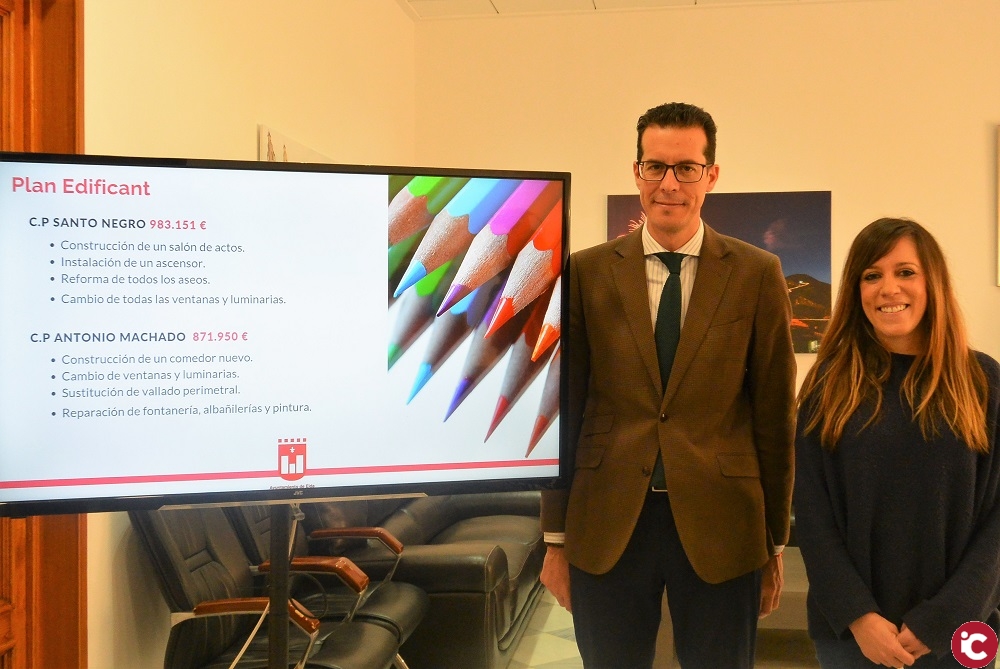 El alcalde de Elda, Rubén Alfaro, junto con la concejala de Educación, Laura Rizo, ha anunciado la adhesión de dos nuevos centros al Plan Edificant: el C.P Santo Negro y el C.P Antonio Machado.