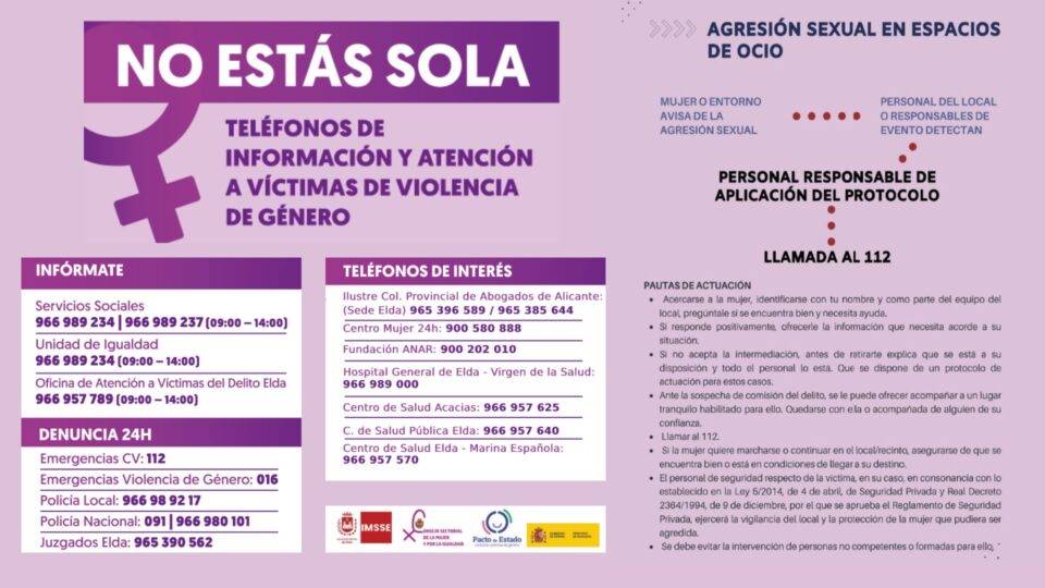 El protocolo forma parte del III Plan de Igualdad de Oportunidades entre Mujeres y Hombres de Elda (2022-2026) y busca crear una red de espacios seguros y violetas donde cualquier persona pueda sentirse protegida y atendida ante una posible agresión.