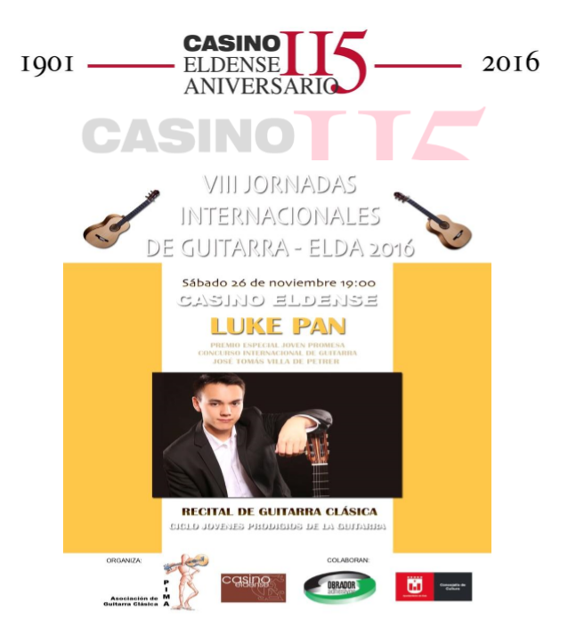 El próximo 26 de noviembre el Casino Eldense contará con la presencia de Luke Pan (Alemania) en un recital de guitarra clásica.