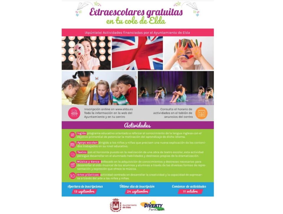 El próximo miércoles se abre un nuevo plazo de inscripción para cubrir las plazas libres del programa de actividades extraescolares gratuitas en los centros educativos de Elda