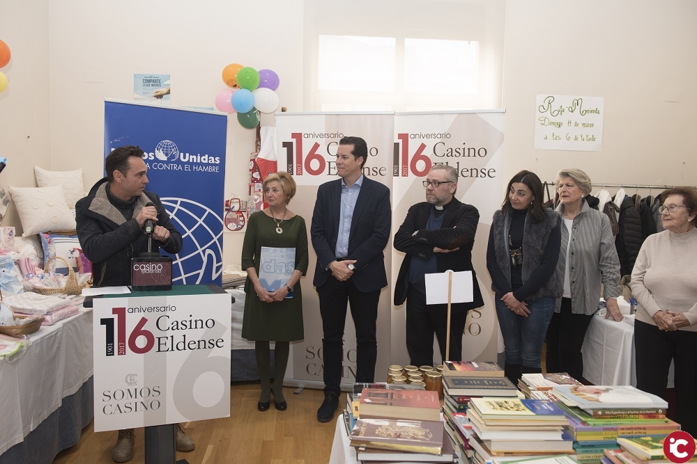 En la Sala de Exposiciones del Casino Eldense ya está abierto el Rastrillo 2018 de Manos Unidas y la Acción Parroquial de La Inmaculada de Elda con motivo de su campaña anual contra el hambre, denominada esta vez Comparte lo que importa. La recaudación que se obtenga será destinada a la construcción de 25 aulas en 20 poblaciones de la India para 625 niños de una zona muy pobre de este territorio. Estas personas, por muy lejos que estén, son nuestras, son como nosotros, hijos de Dios declaró en la inauguración Jeanie Maciá, una de las responsables de Acción Católica de la iglesia de La Inmaculada, encargada junto a Manos Unidas de la organización del Rastrillo, que ha alcanzado los 40 años en Elda. Rubén Alfaro, alcalde de Elda, ensalzó la labor de las voluntarias, porque la mayoría sois mujeres y mostró orgullo como alcalde de que la campaña se dedique a algo tan importante como la educación. Ernesto Obrador, presidente del Casino Eldense, manifestó que el mensaje de la campaña -comparte lo que importa- es magnífico. Compartimos mensajes, correos, WhatsApp y cuántos de ellos prescindibles, sin contenidos. Por el contrario -añadió Obrador- parece que ya no compartimos como debemos miradas, saludos, gestos o abrazos. Francisco Berná, cura párroco de la Iglesia de la Inmaculada se encargó de inaugurar y pedir por el Rastrillo, las mujeres voluntarias y por el amor al prójimo.
