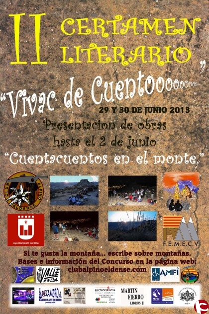 En la noche del sábado al domingo se llevará a cabo en el paraje «El Perrió» el fallo del jurado del II Certamen Literario y Vivac de Cuentos que ha organizado el Club Alpino eldense. Durante la velada habrá varias sorpresas que animarán la noche, como música en directo, iluminación artística y observación de las estrellas, con la participación de la Asociación «Amigos de la Astronomía». A esta actividad se pueden sumar todas las personas que quieran, avisando previamente al Club Alpino en su sede, en el Centro Excursionista Eldense, el viernes a partir de las 20.30h.