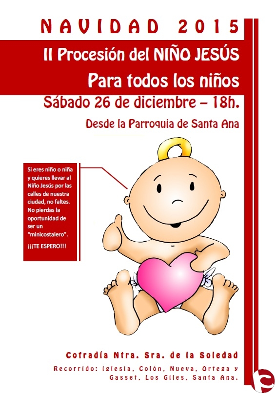 Nuestra cofradía, en un intento de acercar a los más pequeños la Navidad y vivir un momento diferente en estas fiestas por segundo año, celebrará el sábado 26 diciembre a las 18h. desde la Parroquia de Santa Ana, la procesión del Niño Jesús, en la que los niños y niñas de la ciudad serán los protagonistas, ya que es una procesión y desfile pensado para ellos. Ello serán los portadores del trono del niño. La convocatoria se hace para cualquier niño de entre 5 y 13 años que desee acudir, solo hace falta acudir y no es necesario ser cofrade, ni pertenecer a ninguna cofradía. Durante el recorrido que durará alrededor de una hora, se interpretarán villancicos y se repartirán estrellas a los que contemplen el transcurso del desfile.