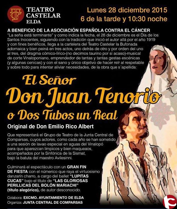 «El señor Don Juan Tenorio o dos tubos un real» se trata de un texto que escribió hace 96 años el eldense Emilio Rico como parodia a la obra de José Zorrilla. Pero a pesar de los años que lleva realizandose esta obra, casi una centena sigue enganchando a todos los eldenses a volver a verlo cada año, gracias, en parte a las nuevas bromas que se van incluyendo cada año.