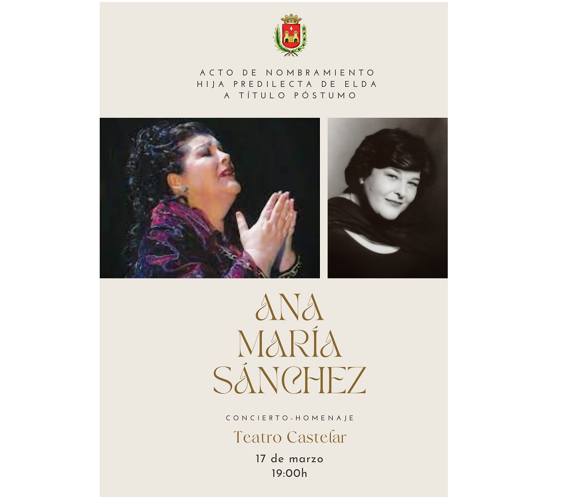 14 de marzo de 2023.- El Teatro Castelar acoge el próximo viernes, a partir de las 19.00 horas, el acto de nombramiento de Ana María Sánchez como Hija Predilecta de Elda a título póstumo, reconocimiento que el Pleno del Ayuntamiento aprobó por unanimidad el pasado 28 de noviembre. Hay que recordar que la soprano eldense falleció el 17 de septiembre de 2022 a los 63 años de edad.