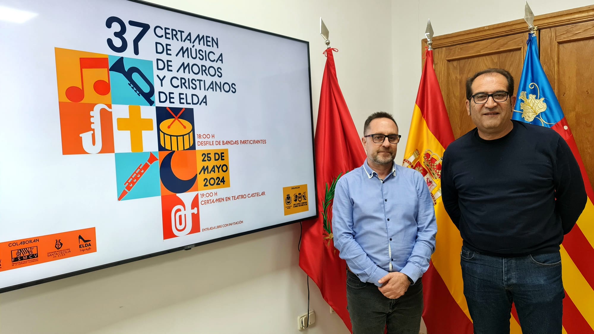 9 de noviembre de 2023.- El concejal de Fiestas, David Guardiola, y el presidente de la Junta Central de Comparsas de Moros y Cristianos de Elda, Pedro Serrano, han presentado esta mañana la edición número 37 del Certamen de Música de Moros y Cristianos que se celebrará el 25 de mayo de 2024.