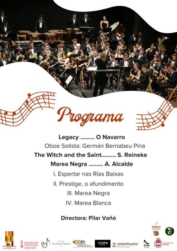 La encargada de dirigir a la banda será la directora Pilar Vañó. El programa comenzará con la pieza ‘Legacy’ de O. Navarro y contará con un oboe solista: Germán Bernabeu Pina; continuará con ‘The Witch and the Saint’, de S. Reineke, y finalizará con ‘Marea Negra’, de A. Alcalde, que se compone de cuatro partes: ‘Espertar nas Rías Baixas’, ‘Prestige, o afundimento’, ‘Marea Negra’ y ‘Marea Blanca’.