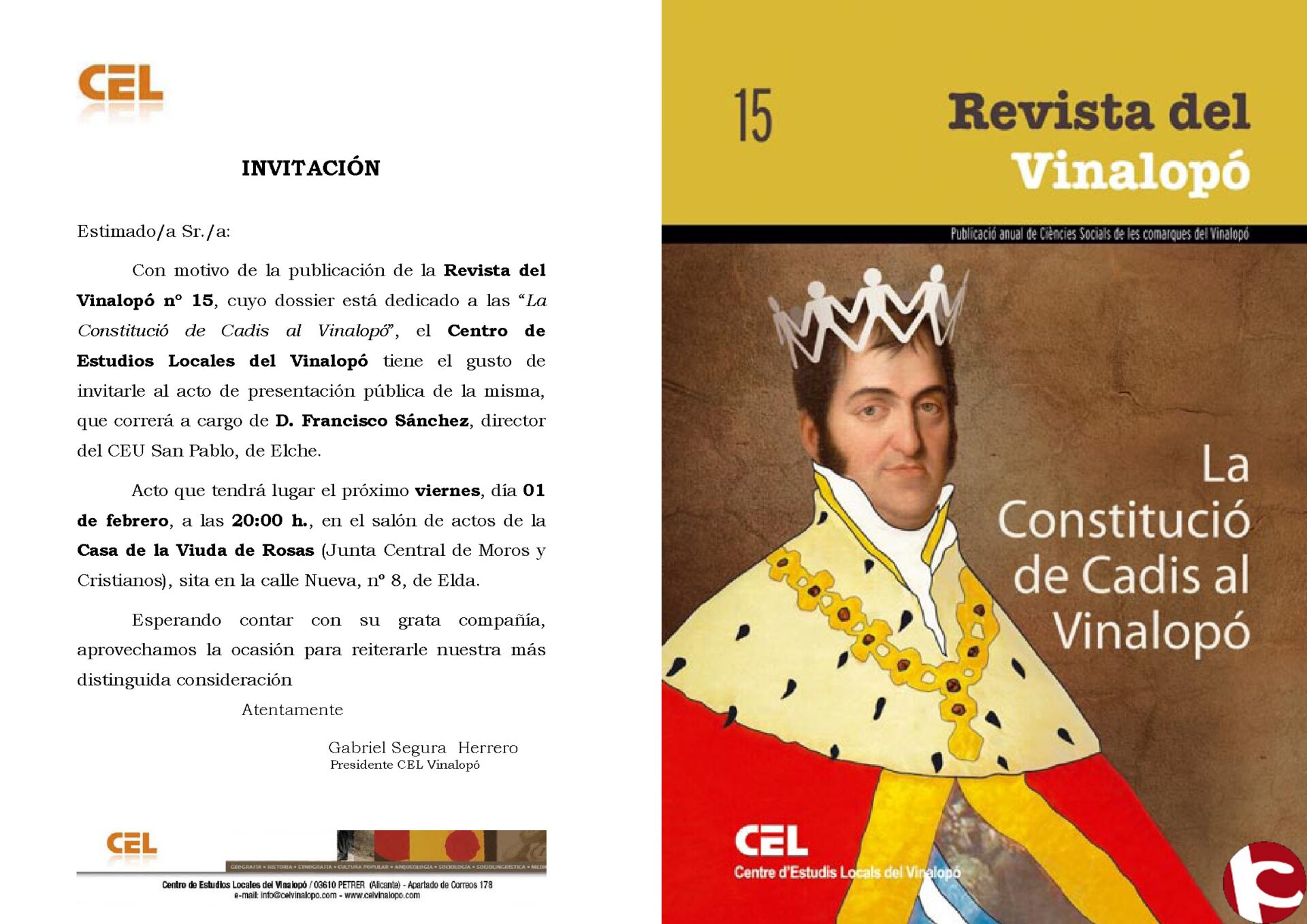 El viernes 1 de febrero se llevará a cabo el acto de presentación de la REVISTA DEL VINALOPO, n º 15, a las 20:00 h, en el Salón de Actos de la Casa de la Viuda de Rosas (Sede de la Junta Central de Comparsas), en Elda. El acto contará con la presencia de Francisco Sánchez Martínez, director del CEU-San Pablo, de Elche, como presentador de la misma.
