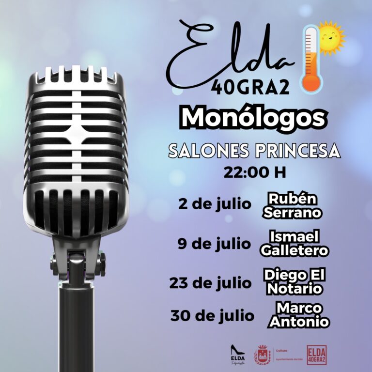 La programación del Elda 40Gra2 estrena mañana el ciclo de monólogos en los Salones Princesa que se desarrollará todos los martes del mes de julio. “A partir de mañana, los Salones Princesa contarán todos los martes de este mes con monologuistas que nos harán pasar una noche entretenida y en la que las risas van a estar aseguradas”, ha destacado el concejal de Cultura, Iñaki Pérez.