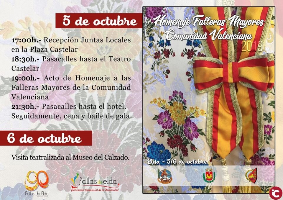 El primer fin de semana del mes de octubre Elda acogerá el Homenaje a las Falleras Mayores de la Comunidad Valenciana. Para ello, desde Junta Central de Fallas y en colaboración con el Ayuntamiento de Elda, se han organizado diferentes actividades.