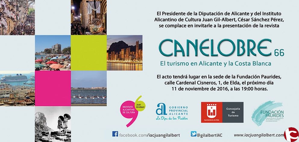 La revista, que en esta edición va dedicada al turismo, se presentó oficialmente este verano en Alicante, aunque también suelen hacer varias presentaciones por distintas localidades de la provincia, siendo Elda la primera vez que acoge este evento. Participará en el acto el diputado de Cultura y vicepresidente de la Diputación César Augusto Asencio, el director del Gil-Albert, Pepe Ferrándiz, el coordinador de ese número de CANELOBRE, Fernando Vera Rebollo, que estarán acompañados de la concejala de Turismo, Belén Alvarado.