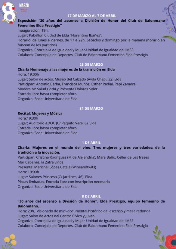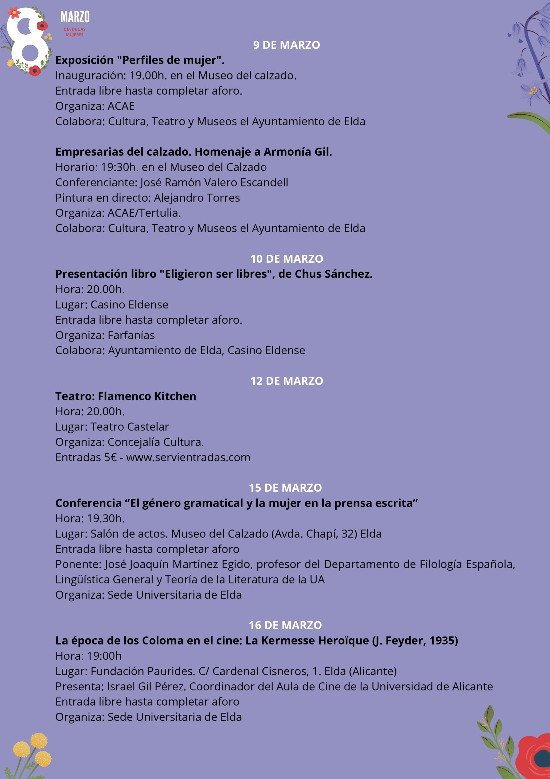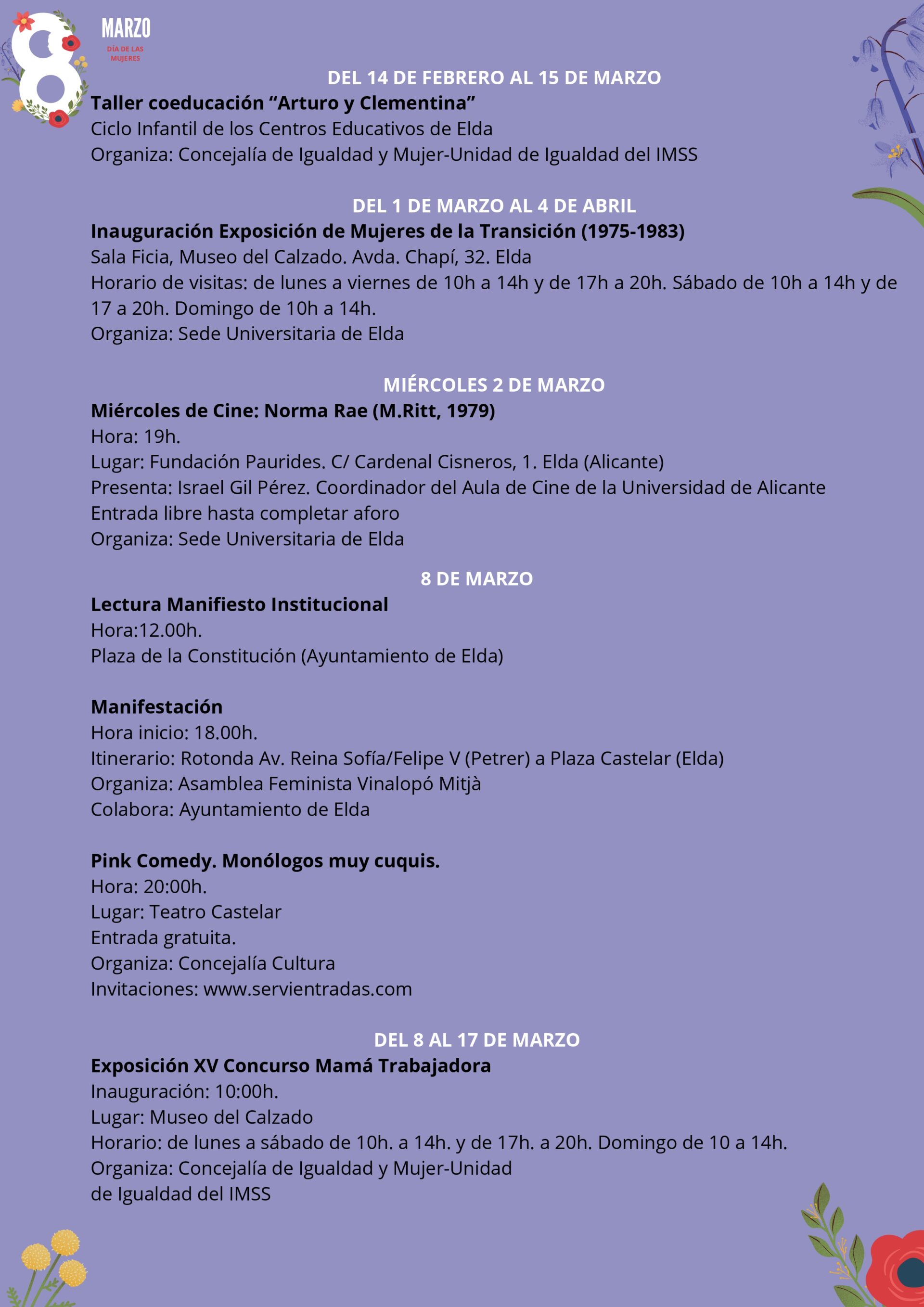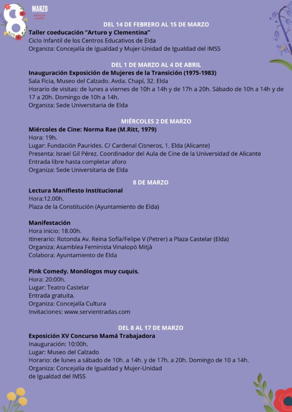 Por último, Rosario Navalón ha afirmado que “Elda está que se sale con un calendario de actividades con motivo del 8-M impresionante. El trabajo de coordinación de las diferentes áreas ha sido complejo para poder cuadrar todos eventos y actividades”.