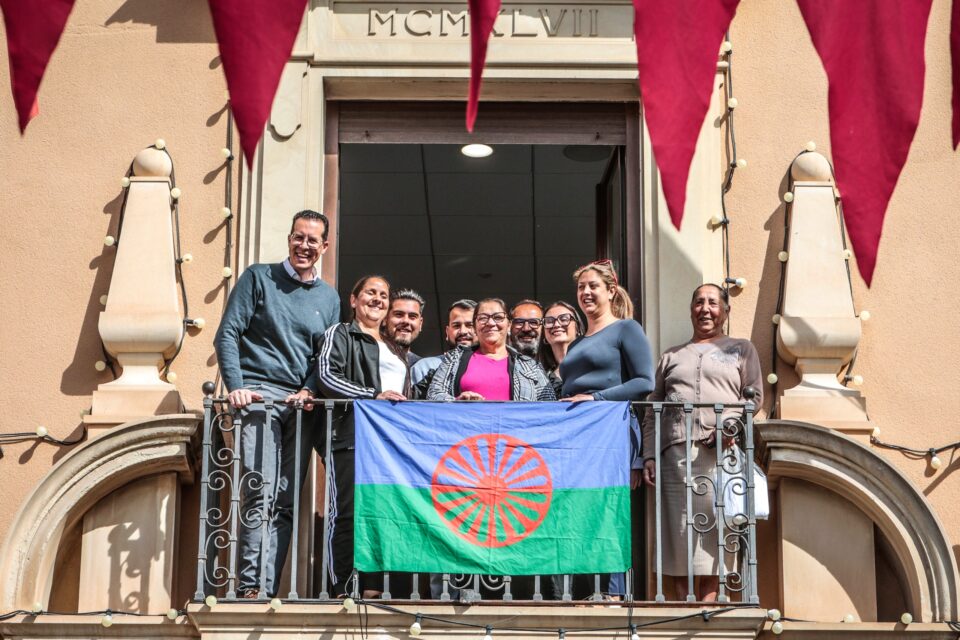 El alcalde de Elda, Rubén Alfaro, acompañado de la edil de Educación, María Gisbert, el concejal de Bienestar Social, David Guardiola, una representación del pueblo gitano de Elda, ha colocado la bandera romaní en uno de los balcones de la Casa Consistorial.