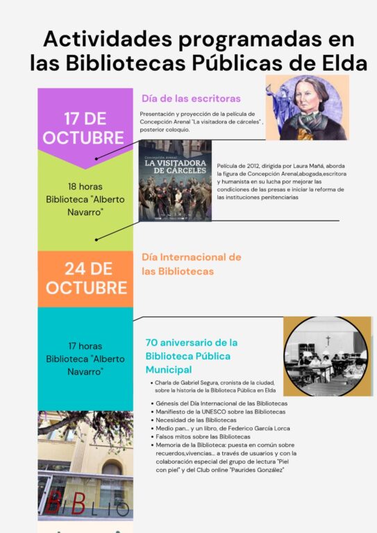 14 de octubre de 2022.- El Ayuntamiento de Elda, a través de la Concejalía de Cultura, celebra el Día Mundial de las Escritoras y el Día Mundial de las Bibliotecas con sendas actividades que tendrán lugar los días 17 y 24 de octubre.