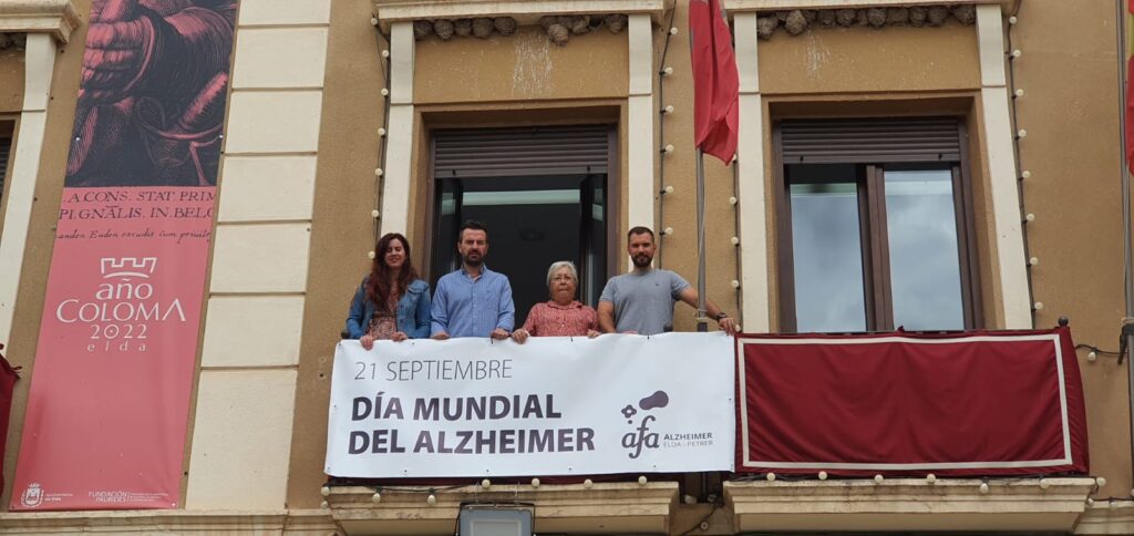 21 de septiembre de 2022.-  El Ayuntamiento de Elda se ha sumado a los actos de conmemoración del Día Mundial del Alzheimer con la lectura de un manifiesto y la colocación de una pancarta en el balcón consistorial. La Corporación Municipal ha acompañado a los representantes de la Asociación de Familiares y Amigos de Enfermos de Alzheimer de Elda, Petrer y comarca (AFA) que se han dado cita en la Plaza de la Constitución.