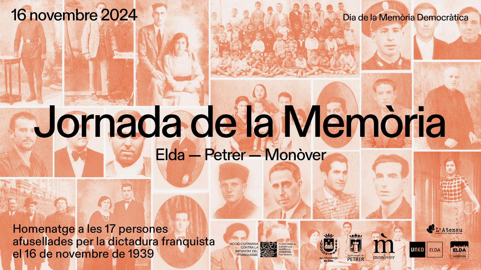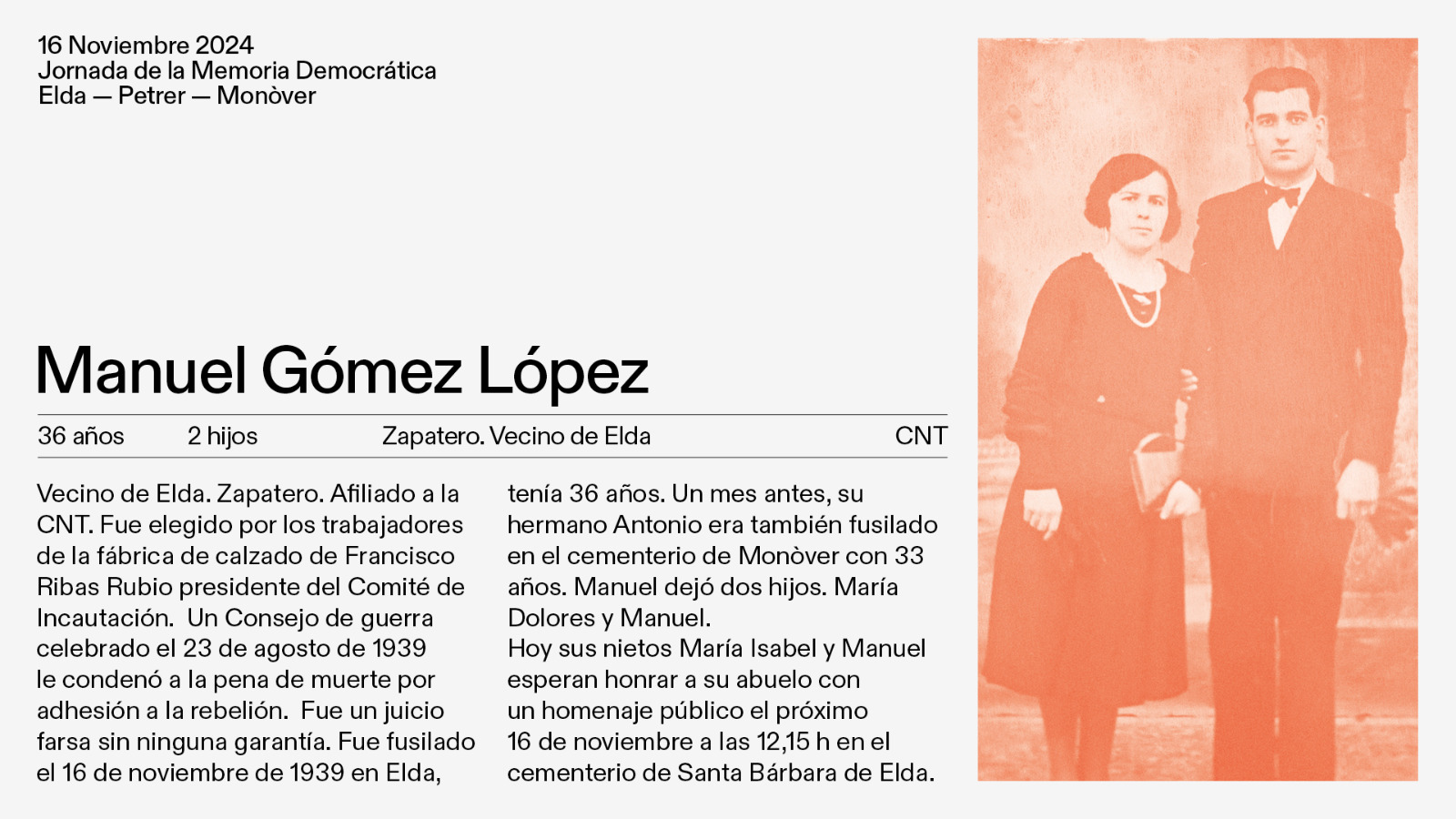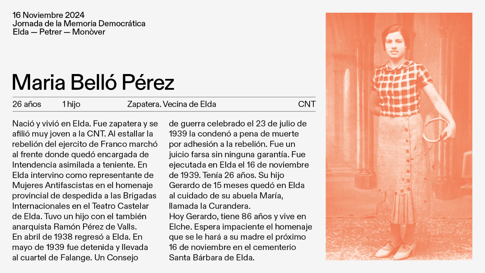 Hay que recordar que en Elda fueron fusilados María Belló Pérez, de 26 años, madre de un niño de 15 meses; Manuel Gómez López, zapatero, sindicalista de CNT, y Elías Ibáñez Morcillo, que presidía el Sindicato Único del Ramo de la Piel. En Petrer fue fusilado su alcalde, Rosendo García Montesinos, del PSOE, y en Monóvar fueron fusiladas tres personas: seis vecinos de Elda, dos de Pinoso y cinco de Monóvar, entre ellos el alcalde socialista Vicente Barberá Tordera. En los homenajes del sábado intervendrán familiares e historiadores locales, junto a representantes municipales.