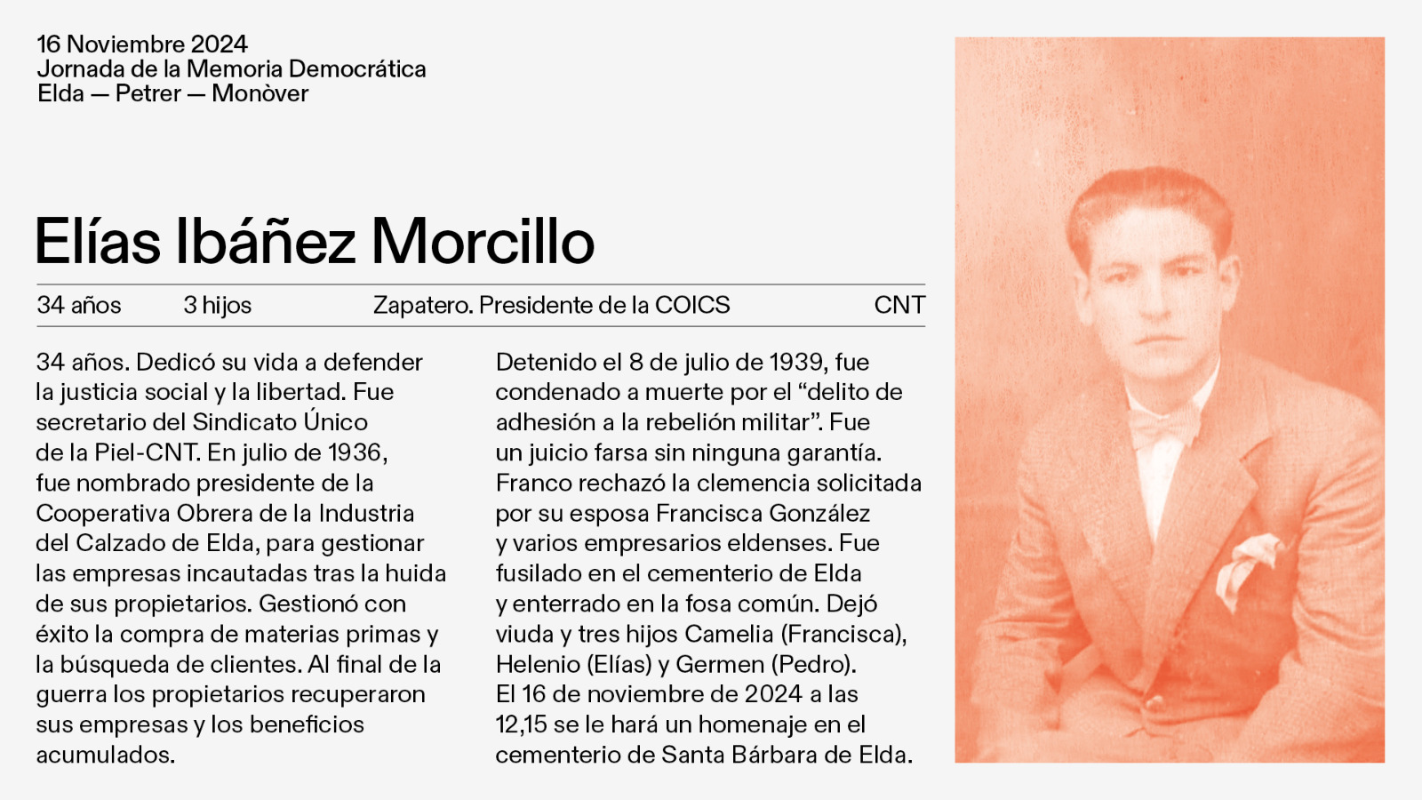 El acto ha sido presentado esta mañana en una comparecencia en la que han participado los concejales de Memoria Democrática de los Ayuntamiento de Elda, Petrer y Monóvar, María Gisbert, Fernando Portillo y Julia Tortosa, respectivamente; Manuel de Juan, representante de la comisión organizadora de los actos, y Paqui Ibañez, nieta de Elías Ibáñez Morcillo, fusilado en el cementerio de Elda el 16 de noviembre de 1939.