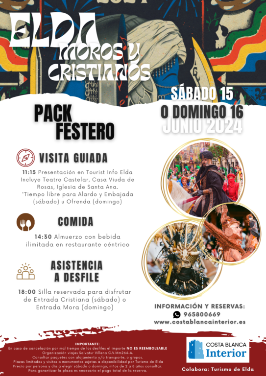 Además, el pack también incluye una comida en un restaurante del centro de la ciudad, con bebidas incluidas, y silla reservada para poder disfrutar de la Entrada Cristiana o de la Entrada Mora. Opcionalmente, las personas que lo deseen pueden reservar alojamiento a través de la agencia que gestiona el pack. Para más información y reservas, las personas interesadas pueden llamar al teléfono 965 500 669 o acceder a la web www.costablancainterior.es