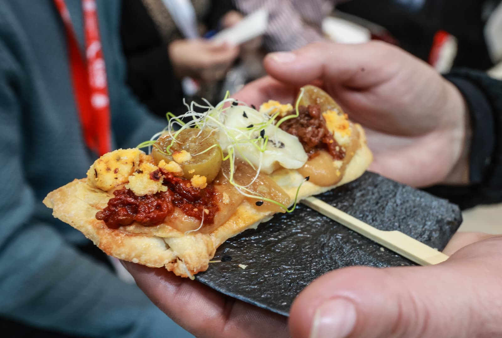 ‘Elda en un bocado’ es una tapa que concentra la identidad y los sabores tradicionales de Elda en un solo bocado. Parte de una base de la torta de migas, crujiente y aromática, que sirve de soporte. Sobre ella se dispone una praliné de fandango (plato típico de Elda), que aporta profundidad, textura cremosa y un guiño a los sabores locales reinterpretados. Encima, un moje de tomate, cebolla, ñora y bacalao del propio fandango. El toque final lo ponen unas uvas en escabeche, que equilibran el conjunto con acidez y dulzor y unas migas de ñora, que refuerzan el aroma, el color y la identidad del plato. El punto crujiente lo aporta unas almendras fritas. Esta y otras tapas se podrán disfrutar en las Terceras Jornadas Gastronómicas Sabor a Elda del 5 al 15 de marzo de 2026.